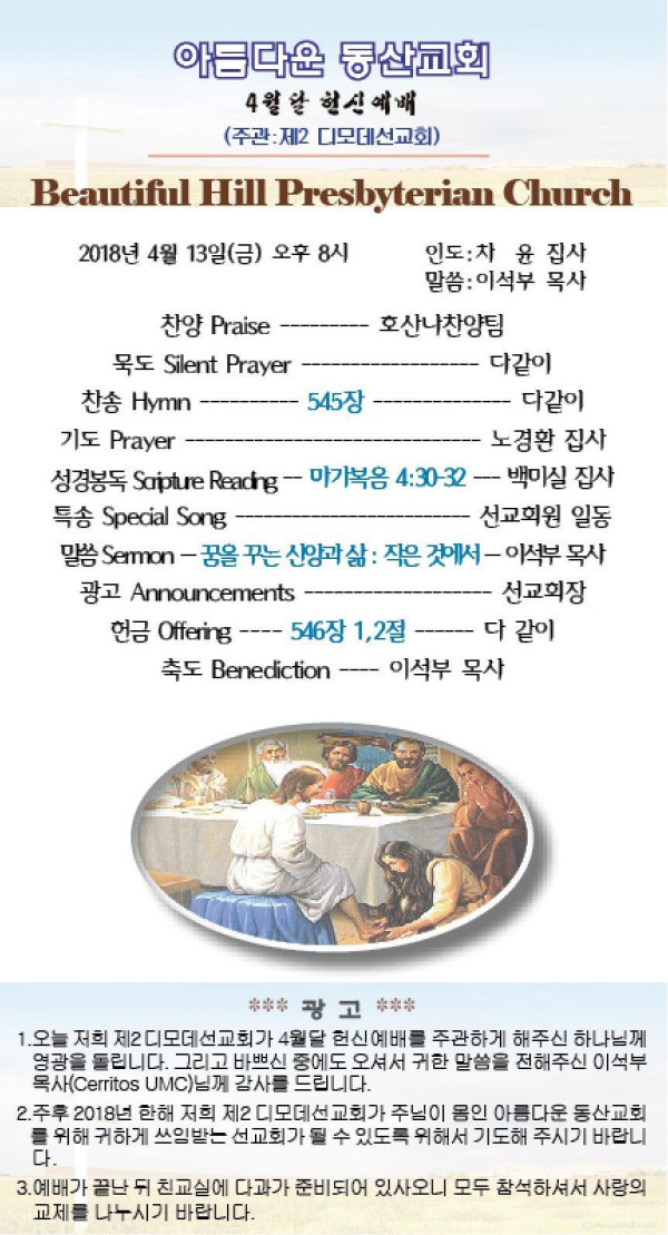 04/13/18 4월달 헌신예배(주관:제2 디모데선교회) 페이지 정보 작성자 댓글 0건 조회 3,353회 작성일 18-04-17 00:00 목록 본문 이전글04/22/18 원경숙 권사 90세 생신 축하파티 18.04.23 다음글2018 고난주간 특별새벽기도회 (Kids & Youth) 18.04.02 댓글 0 댓글목록 등록된 댓글이 없습니다. 목록