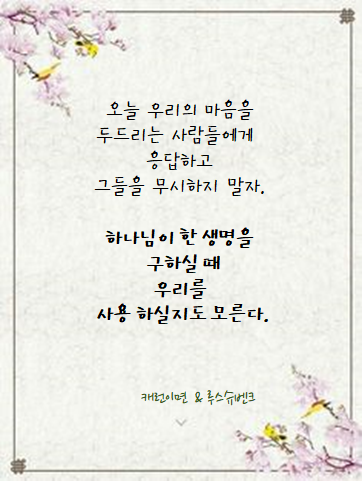 기도를 통하여 우리는 고요한 주님의 임재 속으로 들어갈 수 있고, 계속 나아갈 힘을 얻게 됩니다.