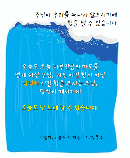 오늘도 우리를 향한 그 약속을 지키시기 위하여 늘 우리 안에 거하시고 능력을 베푸시는 그 하나님이 나의 하나님을 믿고 섬기시기를 축원합니다