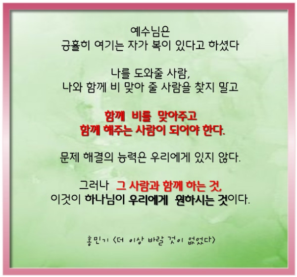 오직 주님만 의지하며 더움을 간구할 때 자비와 궁훌을 베풀어 주소서. 위기 한 가운데서 주님이 보내 주신 도움의 손길을 만나게 하소서.