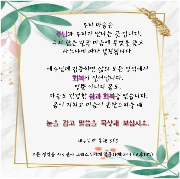 ※ 오늘의 기도: 주님 ! 말씀을 삶으로 살아 내며 모든 상황에 감사하고 자족할 때, 주님과 동행하는 참된 성도의 모습에 세상이 놀라고 감동할 것을 믿습니다.