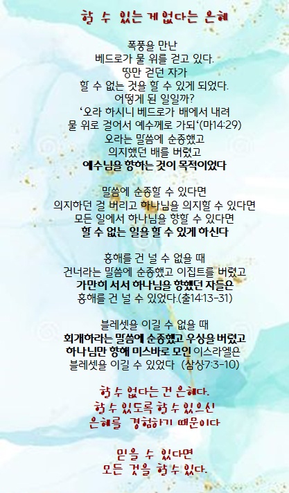 ※ 오늘의 기도: 타인과 믿음의 공동체를 위하기다는 제 유익에만 골몰했던 이기심을 회개합니다.
