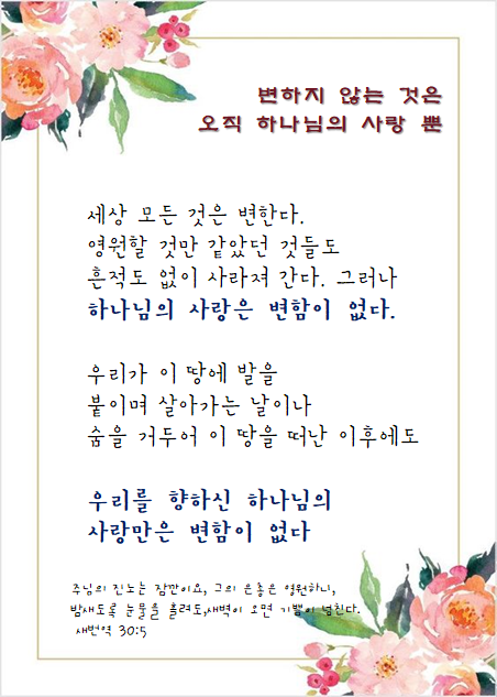 앞으로 우리에게 어떤 일이 닥쳐도 우리 모두 믿음의 승리자로 들어나시길 소원합니다.
