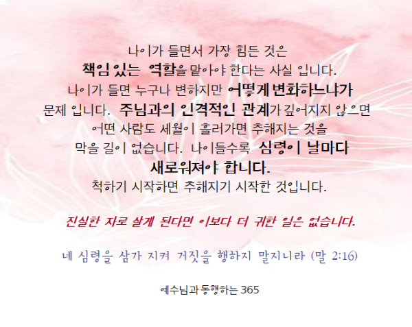 November 29, 2022 . 아름다운동산교회 11/29 매일 묵상 페이지 정보 작성자 아름다운동산교회 댓글 0건 조회 1,724회 작성일 22-11-29 08:50 목록 본문 의인의 소망은 즐거움으로 이루어도 악인의 소망은 끊어지느니라 . (잠 10:28) The prospect of the righteous is joy, but the hopes of the wicked come to nothing. 이전글11/30 매일 묵상 22.11.30 다음글11/28 메일 묵상 22.11.28 목록