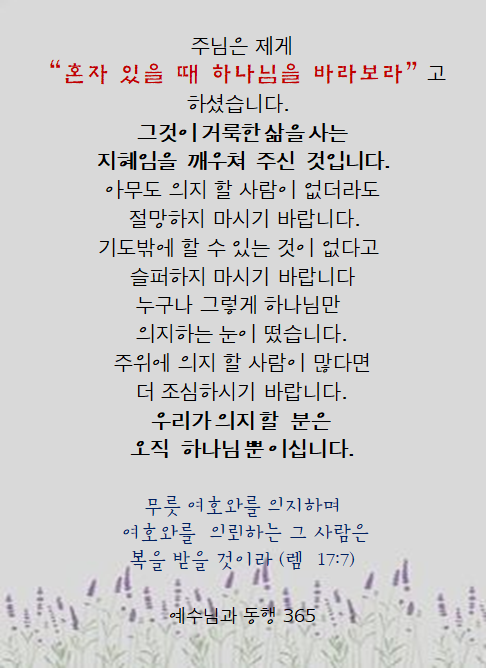 October 25, 2022 . 아름다운동산교회 10/25 매일 묵상 페이지 정보 작성자 아름다운동산교회 댓글 0건 조회 1,720회 작성일 22-10-25 08:18 목록 본문 구하오니 주의 종에게 하신 말씀대로 주의 인자하심이 나의 위안이 되게 하시며 (시 119:76)May your unfailing love be my comfort, according to your promise to your servant. 이전글10/27 매일묵상 22.10.27 다음글10/24 매일 묵상 22.10.23 목록