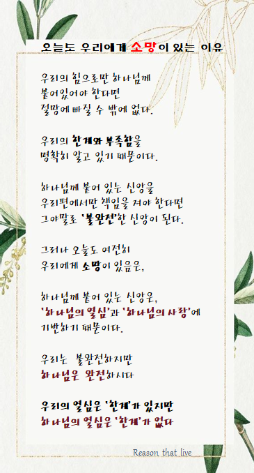 ※ 기도: 잠간의 고난 때문에 마음과 몸이 지치고 힘들 수 있지만 모든 권세를 이기신 주님을 기억하면서 오늘도 담대히 선한 싸움을 믿음으로 살아내는 우리 모두가 되게 하소서.