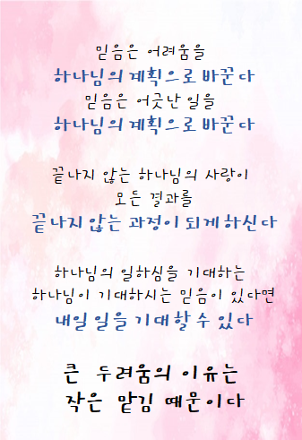 February 04, 2022 . 아름다운동산교회 2/4 매일 묵상 페이지 정보 작성자 아름다운동산교회 댓글 0건 조회 2,324회 작성일 22-02-04 07:00 목록 본문 "지존자여 십현금과 비파와 수금으로 여호와께 감사하며 주의 이름을 찬양하고 아침마다 주의 인자하심을 알리며 밤마다 주의 성실하심을 베풂이 좋으니이다 ." (시편 92:1-3절) 이전글2/05 매일묵상 22.02.05 다음글2/3 매일 묵상 22.02.03 목록