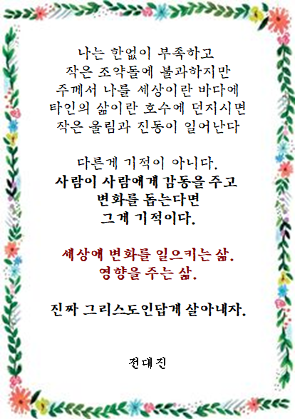 이 산 소망이 그리스도를 닮은 인격으로 변화되도록 자신을 내어 드리면 그 어떤 고난 속에서도 잘 견디어 낼 것입니다.