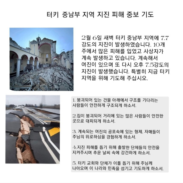 * 더불어 정ㅈㅎ 선교사님이 계신 앙카라에서는 멀리 떨어져 실직적 피해는 없다고 하십니다.