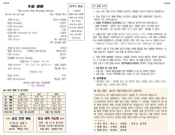 05/26/24 교회 주보 페이지 정보 작성자 아름다운동산교회 댓글 0건 조회 2,338회 작성일 24-05-25 06:45 목록 본문 05/26/24 이전글6/2/24 주일 주보 24.06.02 다음글05/19/24 교회 주보 24.05.18 댓글 0 댓글목록 등록된 댓글이 없습니다. 목록