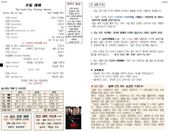 04/21/24 교회 주보 페이지 정보 작성자 아름다운동산교회 댓글 0건 조회 2,294회 작성일 24-04-21 13:19 목록 본문 04/21/24 이전글04/28/24 교회 주보 24.04.27 다음글4월 14일 주일 주보 24.04.07 댓글 0 댓글목록 등록된 댓글이 없습니다. 목록