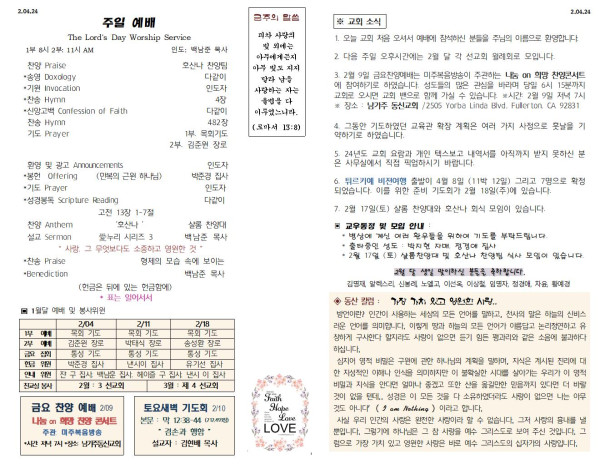 02/04/24 교회 주보 페이지 정보 작성자 아름다운동산교회 댓글 0건 조회 1,898회 작성일 24-02-03 08:15 목록 본문 02/04/24 이전글02/11/24 교회 주보 24.02.09 다음글1/28/24 교회 주보 24.01.27 댓글 0 댓글목록 등록된 댓글이 없습니다. 목록