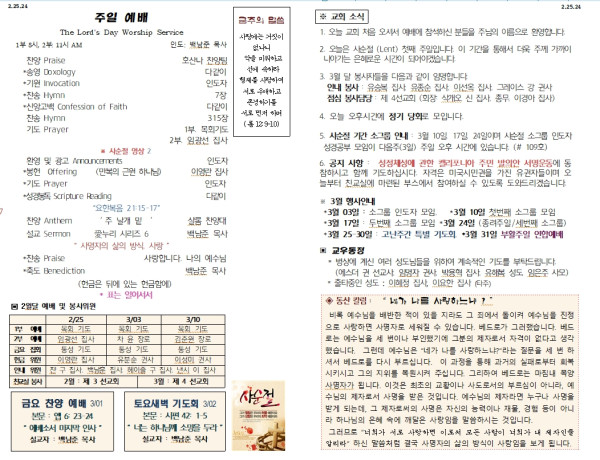 2/25/24 교회주보 페이지 정보 작성자 아름다운동산교회 댓글 0건 조회 2,227회 작성일 24-02-24 08:00 목록 본문 2월 25일 주일 주보 이전글03/03/24 교회 주보 24.03.02 다음글2월 18일 교회주보 24.02.16 댓글 0 댓글목록 등록된 댓글이 없습니다. 목록