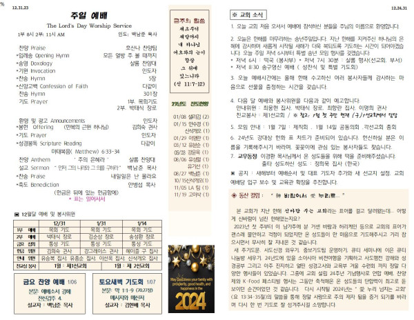 12/32/23 교회 주보 페이지 정보 작성자 아름다운동산교회 댓글 0건 조회 2,376회 작성일 23-12-30 08:04 목록 본문 12/31/23 이전글01/07/24 주일 주보 24.01.06 다음글12/24/23 교회 주보 23.12.23 댓글 0 댓글목록 등록된 댓글이 없습니다. 목록