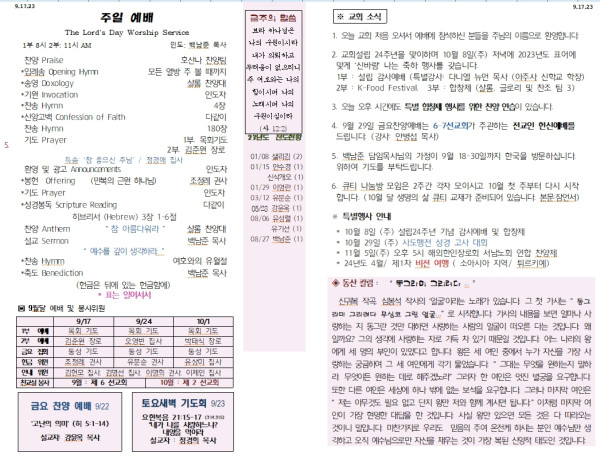 09-17-23 교회 주보 페이지 정보 작성자 아름다운동산교회 댓글 0건 조회 3,114회 작성일 23-09-16 07:36 목록 본문 09-17-23 이전글09-24-23 교회 주보 23.09.17 다음글9월 10일 주보 23.09.09 댓글 0 댓글목록 등록된 댓글이 없습니다. 목록