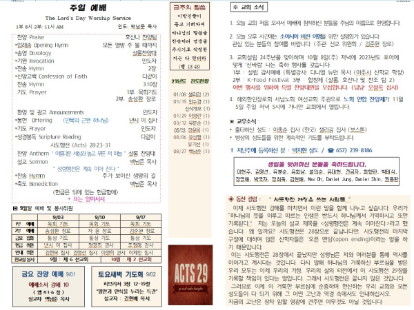 09-03-23 교회 주보 페이지 정보 작성자 아름다운동산교회 댓글 0건 조회 2,374회 작성일 23-09-02 13:40 목록 본문 09-03-23 이전글9월 10일 주보 23.09.09 다음글08-19-23 교회주보 23.08.19 댓글 0 댓글목록 등록된 댓글이 없습니다. 목록