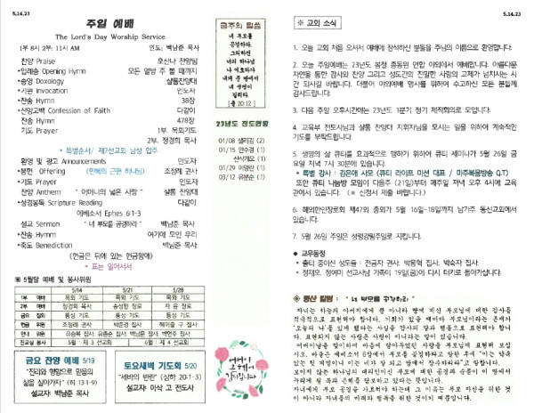 05/14/23 교회 주보 페이지 정보 작성자 아름다운동산교회 댓글 0건 조회 2,789회 작성일 23-05-13 08:03 목록 본문 05/14/23 이전글05/21/23 교회 주보 23.05.20 다음글05/07/23 교회 주보 23.05.06 댓글 0 댓글목록 등록된 댓글이 없습니다. 목록