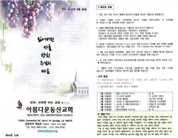 03/26/23 교회 주보 페이지 정보 작성자 아름다운동산교회 댓글 0건 조회 2,250회 작성일 23-03-26 09:05 목록 본문 03/26/23 이전글04/02/23 교회 주보 23.04.01 다음글03/19/23 교회 주보 23.03.18 댓글 0 댓글목록 등록된 댓글이 없습니다. 목록