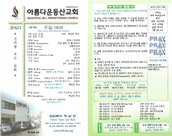 02/05/23 교회 주보 페이지 정보 작성자 아름다운동산교회 댓글 0건 조회 2,283회 작성일 23-02-04 09:15 목록 본문 02/05/23 이전글02/12/23 교회 주보 23.02.11 다음글01/29/23 교회 주보 23.01.28 댓글 0 댓글목록 등록된 댓글이 없습니다. 목록