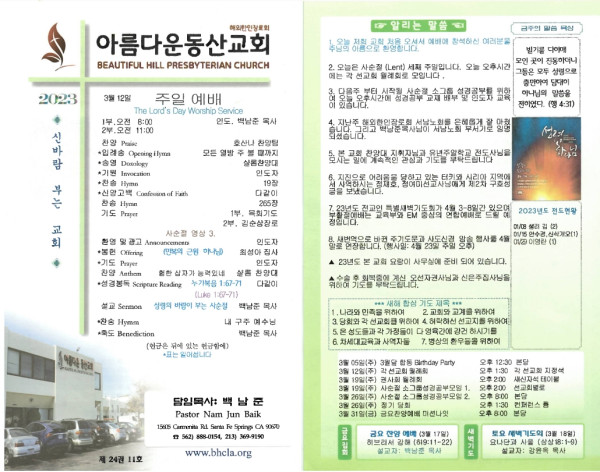 03/12/23 교회 주보 페이지 정보 작성자 아름다운동산교회 댓글 0건 조회 2,276회 작성일 23-03-11 08:32 목록 본문 03-12-23 이전글03/19/23 교회 주보 23.03.18 다음글03/05/23 교회 주보 23.03.04 댓글 0 댓글목록 등록된 댓글이 없습니다. 목록