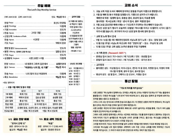 08/31/25 교회 주보 페이지 정보 작성자 아름다운동산교회 댓글 0건 조회 622회 작성일 25-08-30 07:06 목록 본문 08/31/25 이전글09/07/25 교회 주보 25.09.06 다음글08/24/25 교회 주보 25.08.23 댓글 0 댓글목록 등록된 댓글이 없습니다. 목록