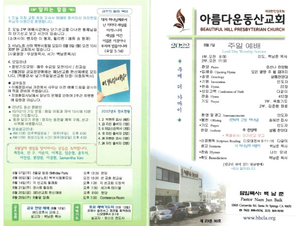 08/07/22 교회 주보 페이지 정보 작성자 아름다운동산교회 댓글 0건 조회 2,619회 작성일 22-08-07 13:17 목록 본문 08/07/22 이전글08/14/22 교회 주보 22.08.13 다음글07/31/22 교회 주보 22.07.30 댓글 0 댓글목록 등록된 댓글이 없습니다. 목록