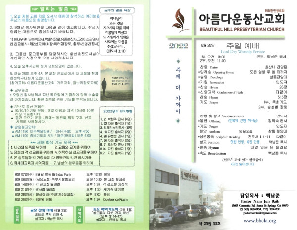 08/28/22 교회 주보 페이지 정보 작성자 아름다운동산교회 댓글 0건 조회 2,379회 작성일 22-08-27 07:54 목록 본문 08/28/22 이전글09/04/22 교회 주보 22.09.03 다음글08/21/22 교회 주보 22.08.20 댓글 0 댓글목록 등록된 댓글이 없습니다. 목록