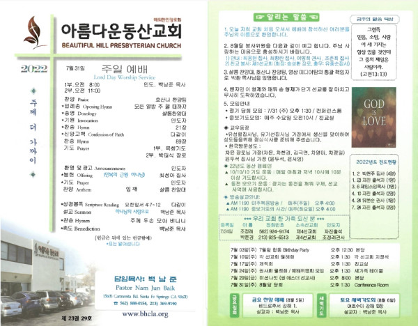 07/31/22 교회 주보 페이지 정보 작성자 아름다운동산교회 댓글 0건 조회 2,859회 작성일 22-07-30 07:21 목록 본문 07/31/22 이전글08/07/22 교회 주보 22.08.07 다음글07/24/22 교회 주보 22.07.23 댓글 0 댓글목록 등록된 댓글이 없습니다. 목록