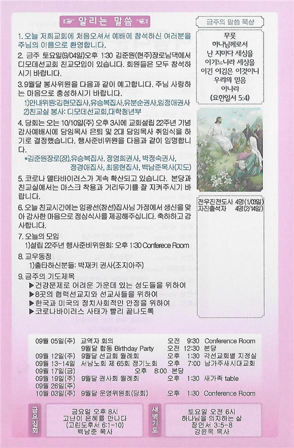 08/29/21 주일 교회 소식 페이지 정보 작성자 댓글 0건 조회 3,607회 작성일 21-08-28 11:52 목록 본문 이전글09/05/21 주일 교회 소식 21.09.04 다음글08/22/21 주일 교회 소식 21.08.21 댓글 0 댓글목록 등록된 댓글이 없습니다. 목록