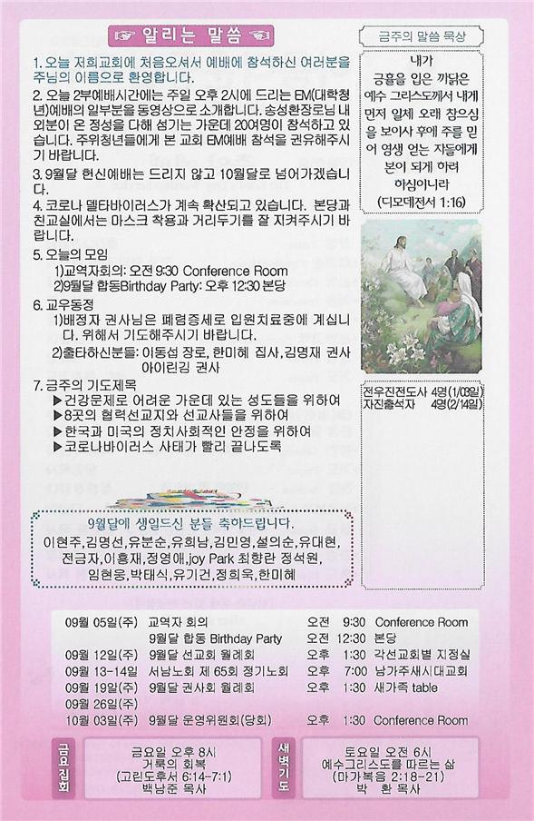 09/05/21 주일 교회 소식 페이지 정보 작성자 댓글 0건 조회 3,622회 작성일 21-09-04 11:47 목록 본문 이전글09/12/21 주일 교회 소식 21.09.11 다음글08/29/21 주일 교회 소식 21.08.28 댓글 0 댓글목록 등록된 댓글이 없습니다. 목록