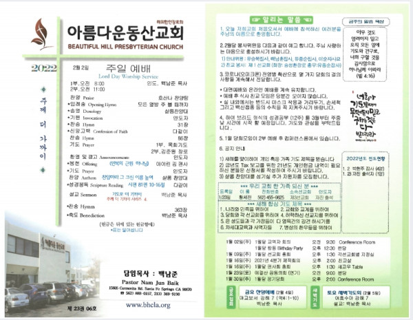 1/30/22 주보 페이지 정보 작성자 아름다운동산교회 댓글 0건 조회 3,161회 작성일 22-02-04 19:17 목록 본문 1/30 주보 이전글2/6/22 교회 주보 22.02.05 다음글09/12/21 주일 교회 소식 21.09.11 댓글 0 댓글목록 등록된 댓글이 없습니다. 목록
