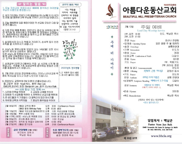 02/13/22 교회 주보 페이지 정보 작성자 아름다운동산교회 댓글 0건 조회 3,144회 작성일 22-02-12 10:17 목록 본문 02/13/22 이전글02-20-22 교회 주보 22.02.19 다음글2/6/22 교회 주보 22.02.05 댓글 0 댓글목록 등록된 댓글이 없습니다. 목록