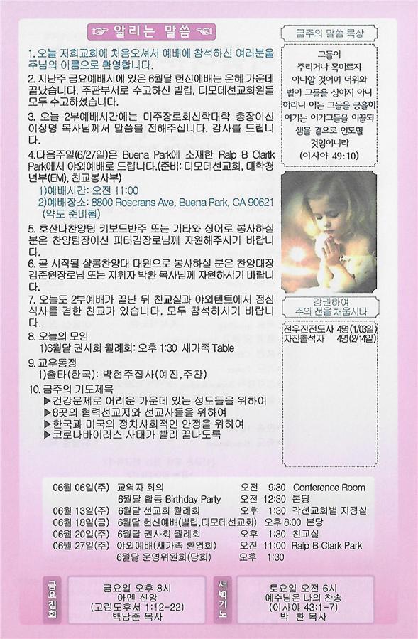 06/20/21 주일 교회 소식 페이지 정보 작성자 댓글 0건 조회 3,221회 작성일 21-06-19 11:12 목록 본문 이전글06/27/21 주일 교회 소식 21.06.26 다음글06/13/21 주일 교회 소식 21.06.12 댓글 0 댓글목록 등록된 댓글이 없습니다. 목록
