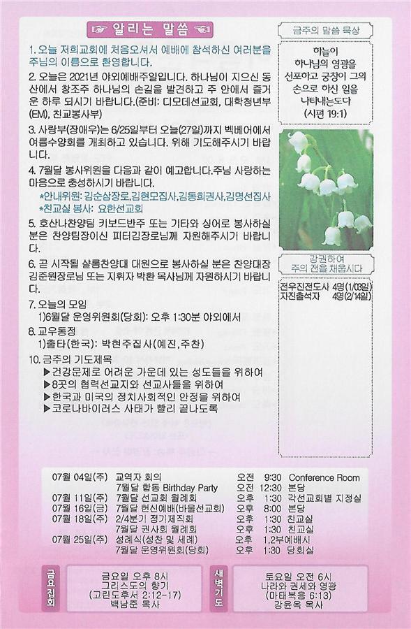 06/27/21 주일 교회 소식 페이지 정보 작성자 댓글 0건 조회 3,433회 작성일 21-06-26 08:28 목록 본문 이전글07/04/21 주일 교회 소식 21.07.03 다음글06/20/21 주일 교회 소식 21.06.19 댓글 0 댓글목록 등록된 댓글이 없습니다. 목록
