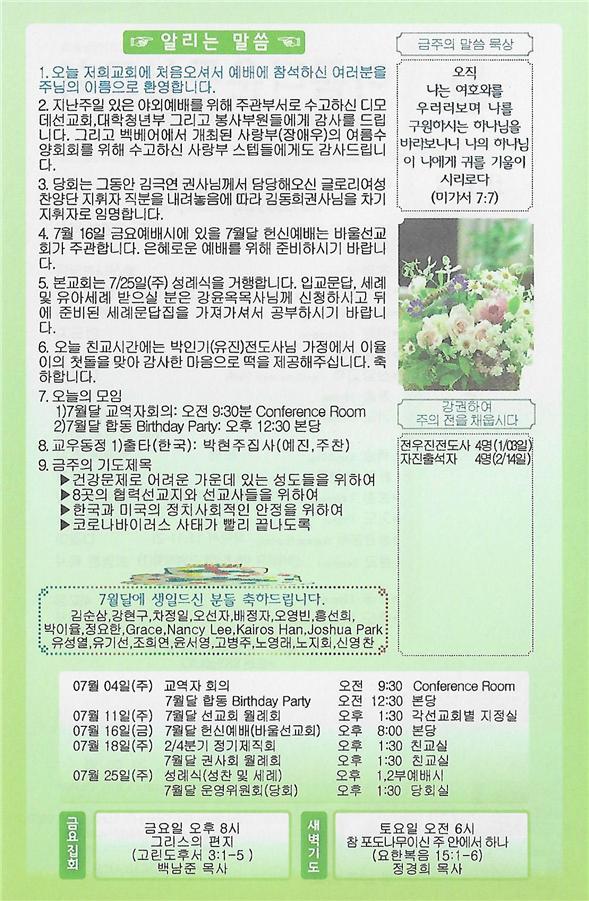 07/04/21 주일 교회 소식 페이지 정보 작성자 댓글 0건 조회 3,581회 작성일 21-07-03 00:00 목록 본문 이전글07/11/21 주일 교회 소식 21.07.10 다음글06/27/21 주일 교회 소식 21.06.26 댓글 0 댓글목록 등록된 댓글이 없습니다. 목록