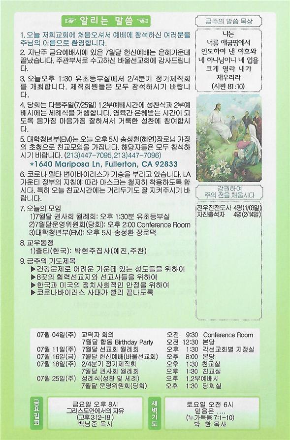 07/18/21 주일 교회 소식 페이지 정보 작성자 댓글 0건 조회 3,379회 작성일 21-07-17 16:31 목록 본문 이전글07/25/21 주일 교회 소식 21.07.24 다음글07/11/21 주일 교회 소식 21.07.10 댓글 0 댓글목록 등록된 댓글이 없습니다. 목록