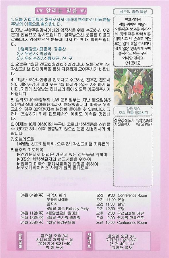 04/11/21 주일 교회 소식 페이지 정보 작성자 댓글 0건 조회 3,154회 작성일 21-04-10 10:54 목록 본문 이전글04/18/21 주일 교회 소식 21.04.17 다음글04/04/21 주일 교회 소식 21.04.03 댓글 0 댓글목록 등록된 댓글이 없습니다. 목록
