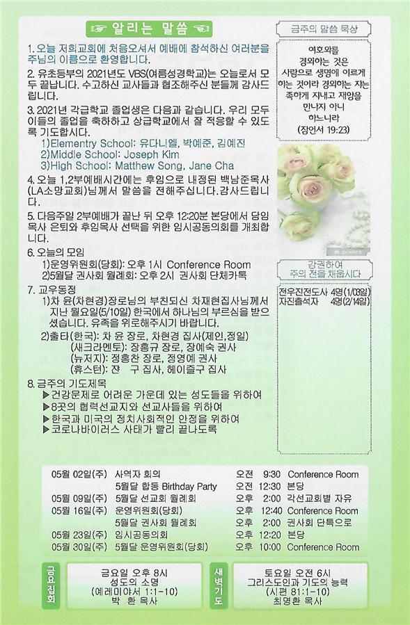 05/16/21 주일 교회 소식 페이지 정보 작성자 댓글 0건 조회 3,312회 작성일 21-05-15 12:26 목록 본문 이전글05/30/21 주일 교회 소식 21.05.29 다음글05/02/21 주일 교회 소식 21.05.01 댓글 0 댓글목록 등록된 댓글이 없습니다. 목록