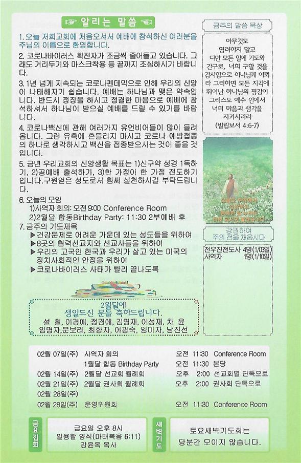 02/07/21주일 교회 소식 페이지 정보 작성자 댓글 0건 조회 3,110회 작성일 21-02-06 11:53 목록 본문 이전글02/14/21 주일 교회 소식 21.02.13 다음글01-31-21 주일 교회 소식 21.01.30 댓글 0 댓글목록 등록된 댓글이 없습니다. 목록