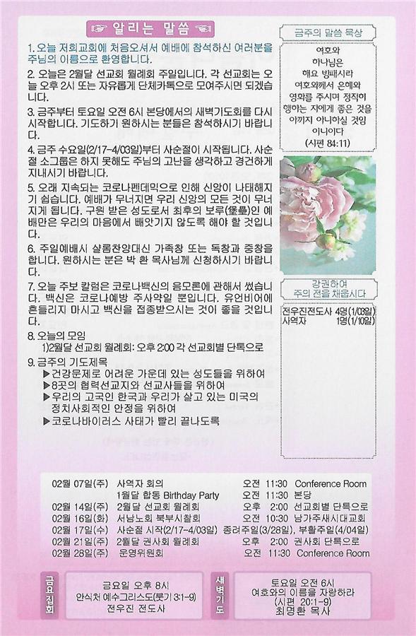 02/14/21 주일 교회 소식 페이지 정보 작성자 댓글 0건 조회 3,210회 작성일 21-02-13 08:38 목록 본문 이전글02/21/21 주일 교회 소식 21.02.20 다음글02/07/21주일 교회 소식 21.02.06 댓글 0 댓글목록 등록된 댓글이 없습니다. 목록