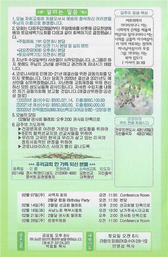 02/21/21 주일 교회 소식 페이지 정보 작성자 댓글 0건 조회 2,838회 작성일 21-02-20 00:00 목록 본문 이전글02/28/21 주일 교회 소식 21.02.27 다음글02/14/21 주일 교회 소식 21.02.13 댓글 0 댓글목록 등록된 댓글이 없습니다. 목록