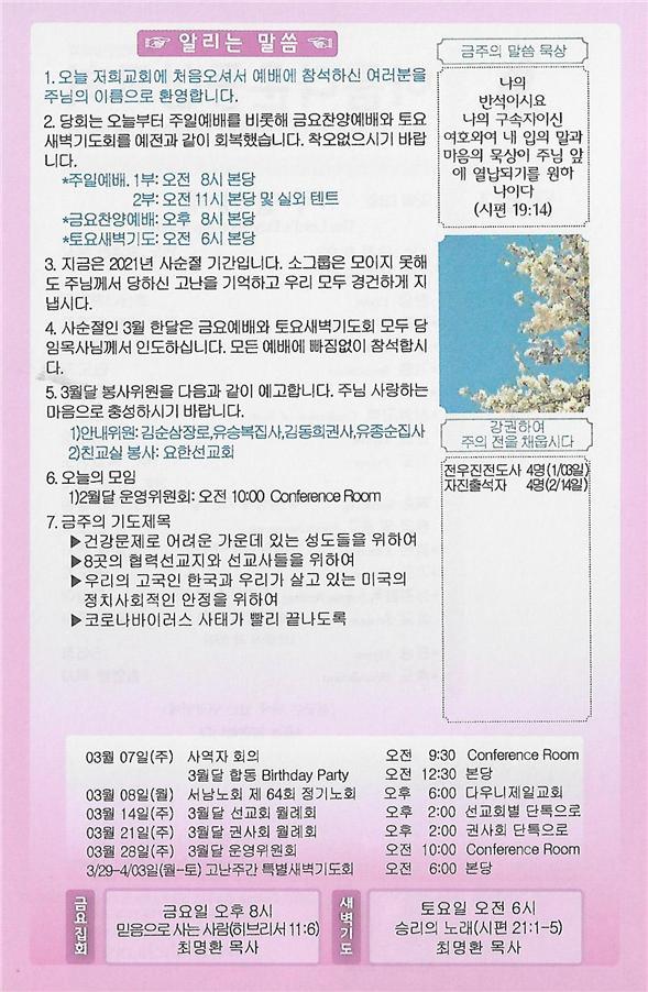 02/28/21 주일 교회 소식 페이지 정보 작성자 댓글 0건 조회 3,150회 작성일 21-02-27 10:54 목록 본문 이전글03/07/21 주일 교회 소식 21.03.06 다음글02/21/21 주일 교회 소식 21.02.20 댓글 0 댓글목록 등록된 댓글이 없습니다. 목록