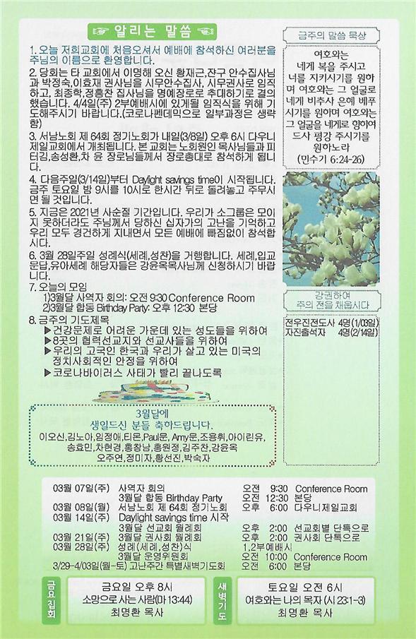 03/07/21 주일 교회 소식 페이지 정보 작성자 댓글 0건 조회 3,342회 작성일 21-03-06 12:02 목록 본문 이전글03/14/21 주일 교회 소식 21.03.13 다음글02/28/21 주일 교회 소식 21.02.27 댓글 0 댓글목록 등록된 댓글이 없습니다. 목록