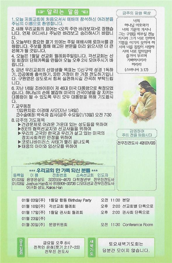 01-10-21 주일 교회 소식 페이지 정보 작성자 댓글 0건 조회 2,884회 작성일 21-01-08 00:00 목록 본문 이전글01/17/21 주일 교회 소식 21.01.16 다음글01-03-21 주일 교회 소식 20.12.31 댓글 0 댓글목록 등록된 댓글이 없습니다. 목록