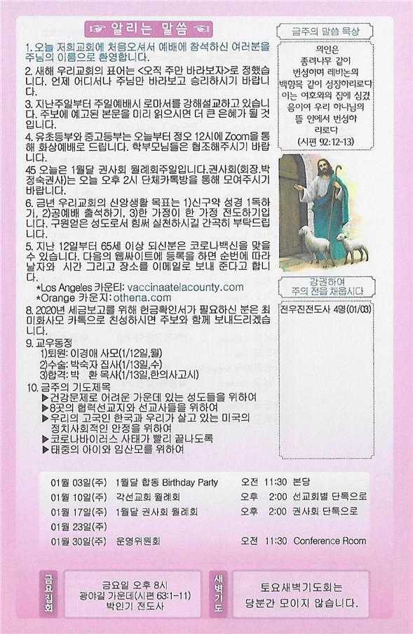 01/17/21 주일 교회 소식 페이지 정보 작성자 댓글 0건 조회 3,144회 작성일 21-01-16 07:58 목록 본문 이전글01/24/21 주일 교회 소식 21.01.23 다음글01-10-21 주일 교회 소식 21.01.08 댓글 0 댓글목록 등록된 댓글이 없습니다. 목록