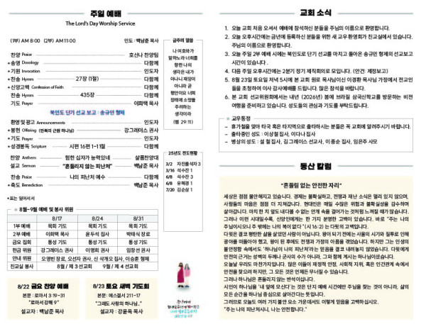 08/17/25 교회 주보 페이지 정보 작성자 아름다운동산교회 댓글 0건 조회 732회 작성일 25-08-16 07:21 목록 본문 08/17/25 이전글08/24/25 교회 주보 25.08.23 다음글08/10/25 교회 주보 25.08.09 댓글 0 댓글목록 등록된 댓글이 없습니다. 목록