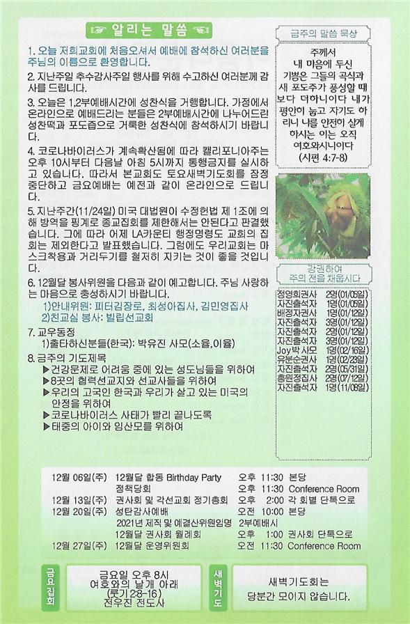 11/29/20 주일 교회 소식 페이지 정보 작성자 댓글 0건 조회 3,268회 작성일 20-11-28 10:45 목록 본문 이전글12/06/20 주일 교회 소식 20.12.05 다음글11/22/20 주일 교회 소식 20.11.21 댓글 0 댓글목록 등록된 댓글이 없습니다. 목록