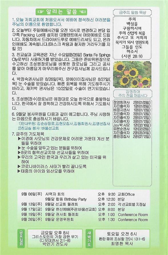 08/30/20 주일 교회 소식 페이지 정보 작성자 댓글 0건 조회 2,935회 작성일 20-08-29 14:23 목록 본문 이전글09/06/20 주일 교회 소식 20.09.05 다음글08/23/20 주일 교회 소식 20.08.23 댓글 0 댓글목록 등록된 댓글이 없습니다. 목록