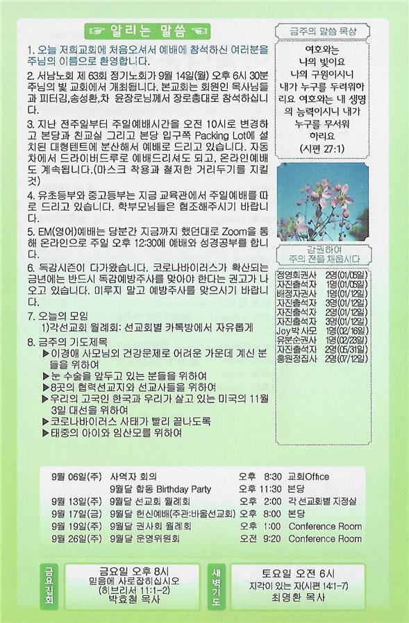 09/13/20 주일 교회 소식 페이지 정보 작성자 댓글 0건 조회 3,274회 작성일 20-09-12 09:51 목록 본문 이전글09/20/20 주일 교회 소식 20.09.19 다음글09/06/20 주일 교회 소식 20.09.05 댓글 0 댓글목록 등록된 댓글이 없습니다. 목록