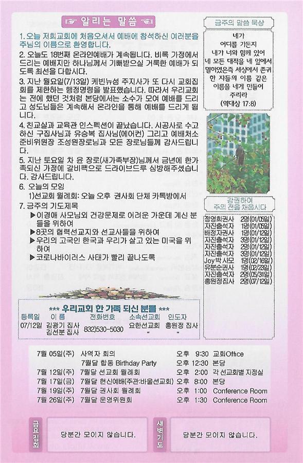 07/19/20 주일 교회 소식 페이지 정보 작성자 댓글 0건 조회 3,278회 작성일 20-07-18 00:00 목록 본문 이전글07/26/20 주일 교회 소식 20.07.25 다음글07/12/20 주일 교회 소식 20.07.11 댓글 0 댓글목록 등록된 댓글이 없습니다. 목록